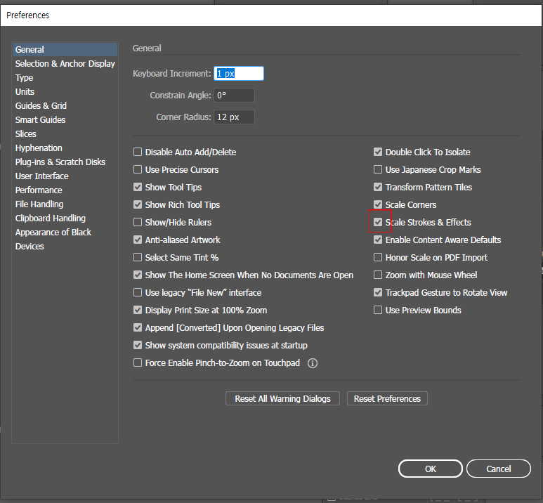 열면 이러한 창이 나오는데 여기서 Scale Stroke & Effects의 체크를 해제시켜주면 됩니다!